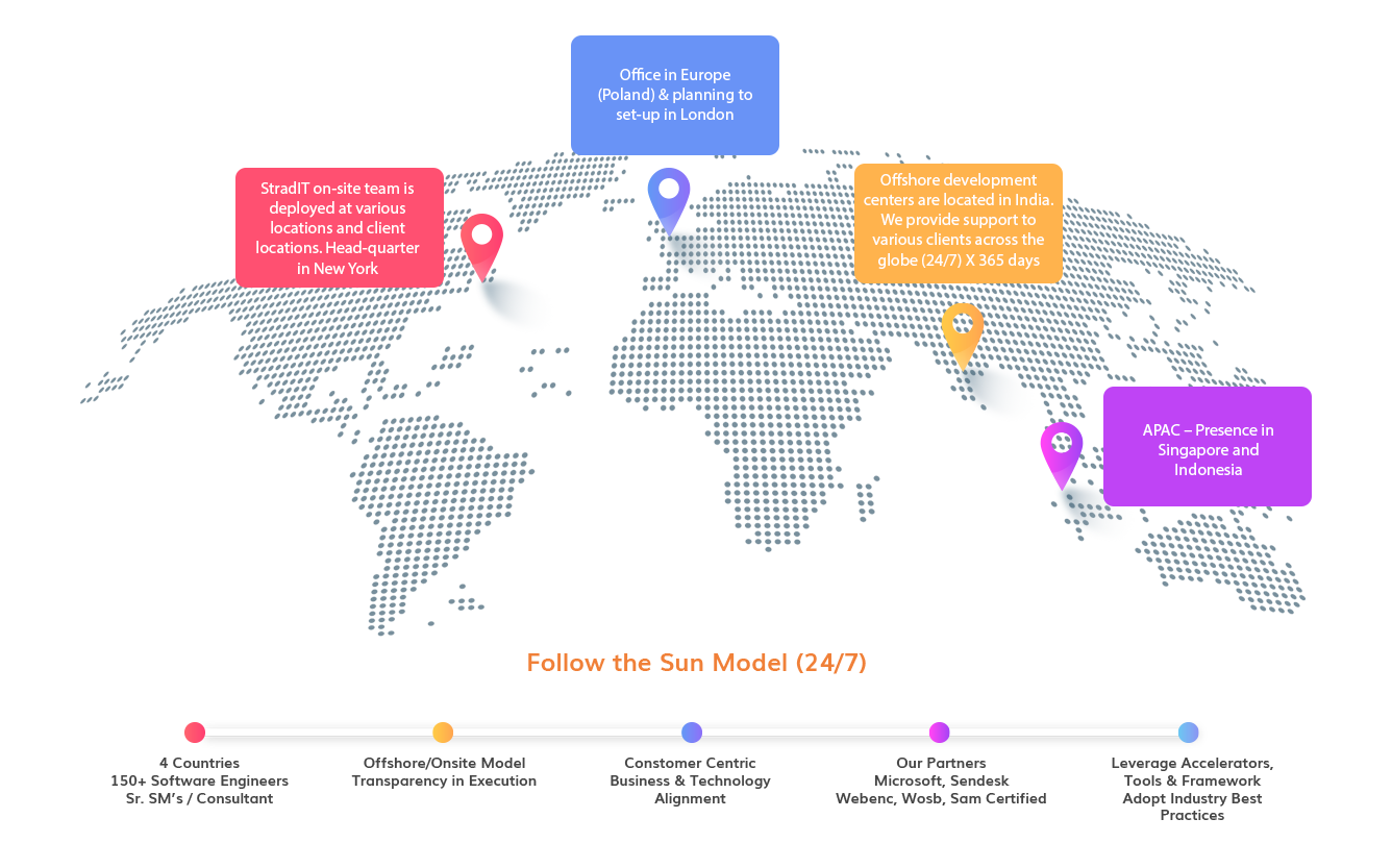 StradIT’s Global Delivery Model ensures consistent delivery of technology and business solutions to our fortune 500 clients from anywhere and anytime. We follow the Sun Model to keep our client business running. Our teams work in projects from various physical / virtual locations globally to ensure better delivery and outcomes. We leverage our experience and best practices in terms of scalable approach, flexibility, specialized technology skills, processes, in order to deliver targeted business solutions.