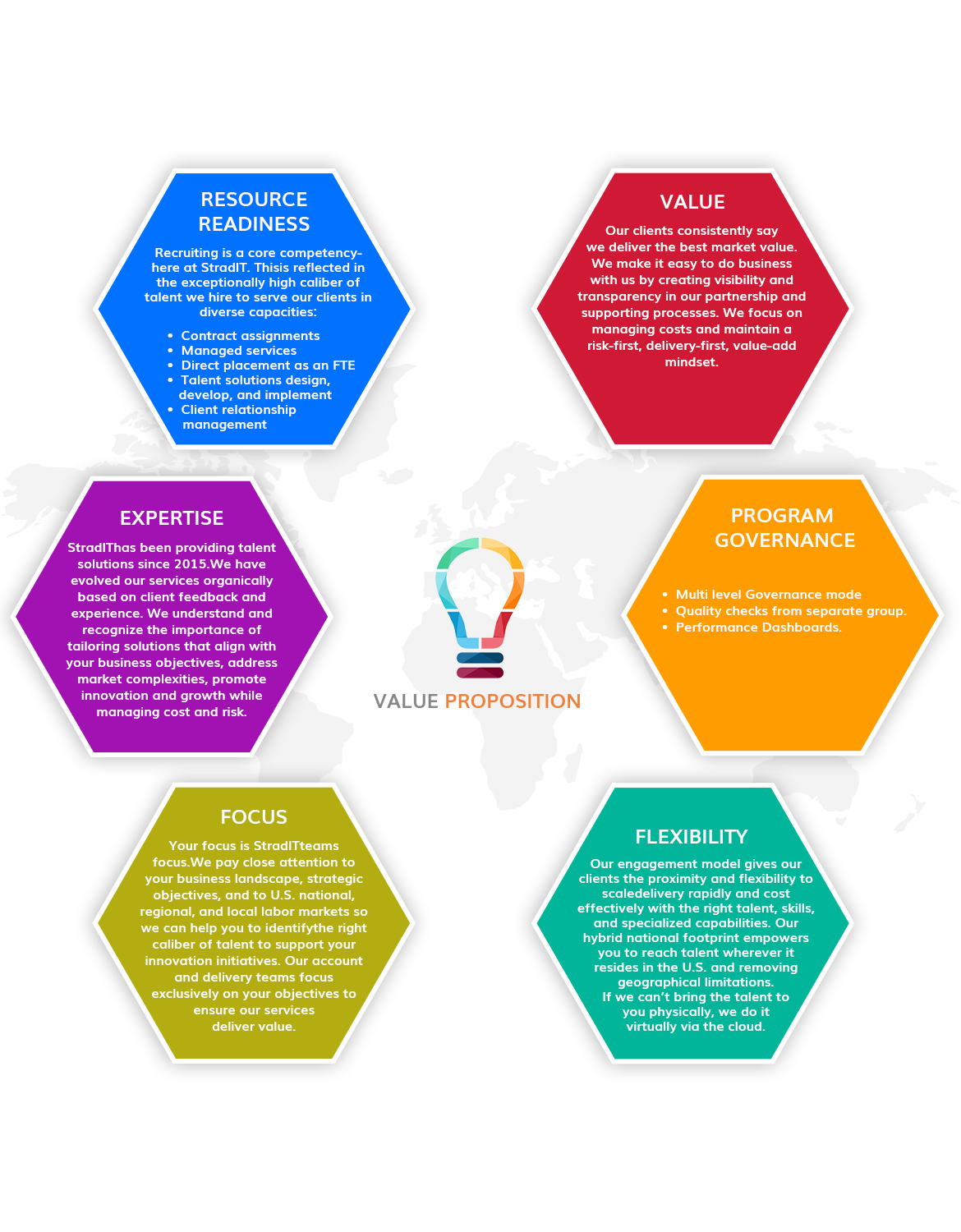 StradIT started with an objective to bring value services to the business in IT and ITES space. We have been constantly adding value to our global customers through our mechanism of solution / technology delivery anytime and anywhere. Our seamless and continuous value creation is based on the below model / framework (designed on 6 pillars) that ensures delivery of technology / business solutions and leading to customer delight.